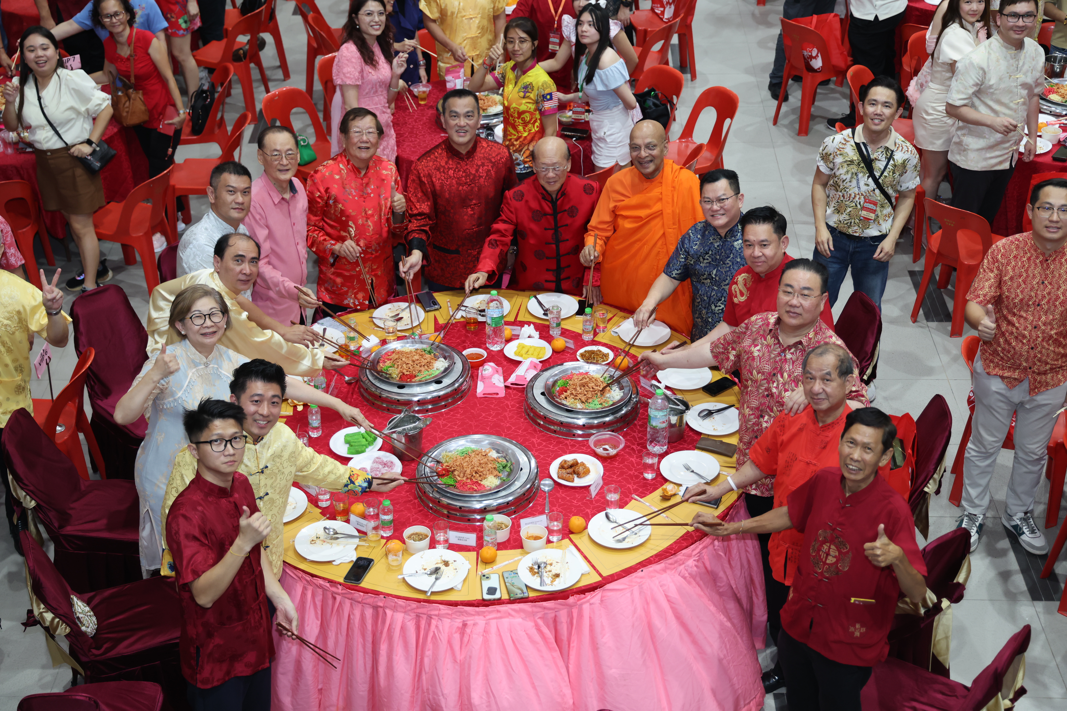 蔡志权(中)与马华堂一众理事欢聚一堂进行新年捞生,现场气氛热闹欢腾。左起为王义栋、刘重庆、丘宝珍、余家福、薛富峰、林家仪博士及张天赐;右起为李沾升、吴恒灿、沈永平、侯健仲、邱进财、达摩拉达那及李伟明。
